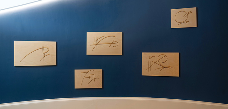 The commissioned work, Ode to justice, A balanced scale, and A people’s practice (pictured), invites reflection on the oath solicitors take, the emotional terrain they navigate and the ethical balance they strive to uphold. The pieces comprise text in stainless steel lettering, a banner and abstract line drawings etched into wood.